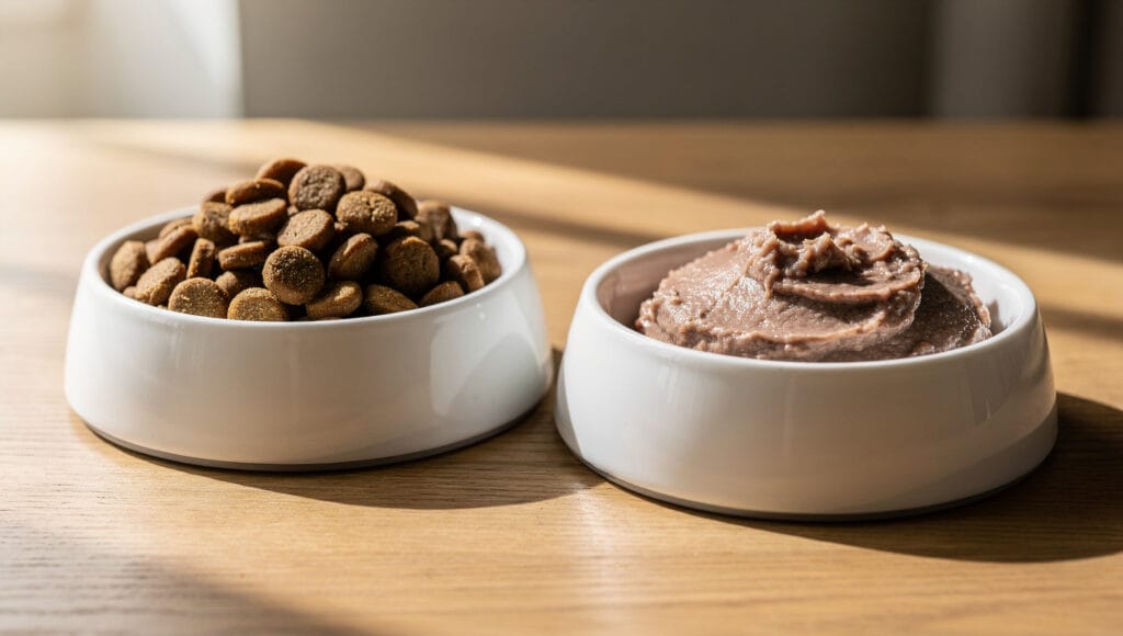 Side-by-side comparison of dry cat kibble and wet canned food bowls.